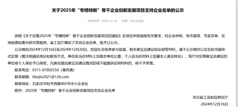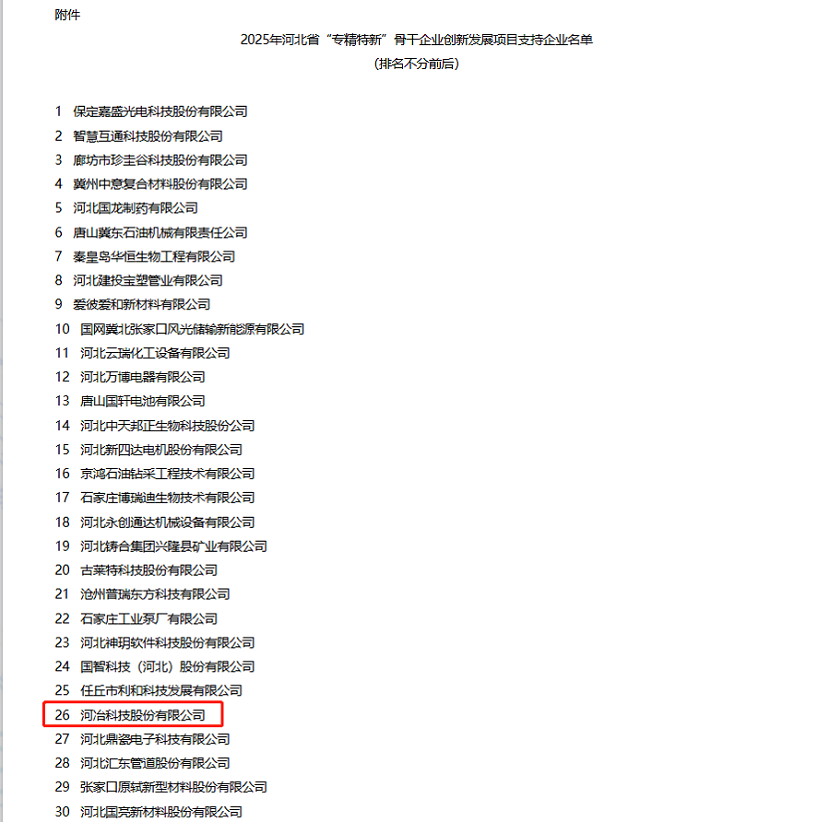 公司入圍河北省“專精特新”骨干企業(yè)創(chuàng)先發(fā)展項目名單